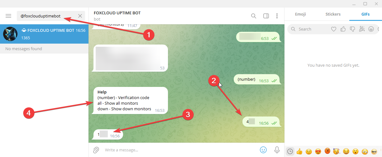 4) After registration, you can communicate with the bot using simple commands: all - show all monitoring tasks, down - show only tasks with incidents, (number) - enter a new code. One telegram account can be linked to multiple Foxcloud monitoring accounts.