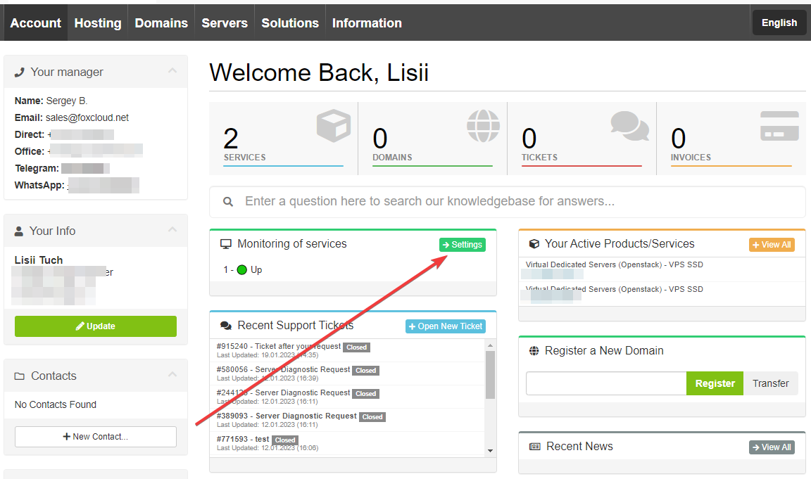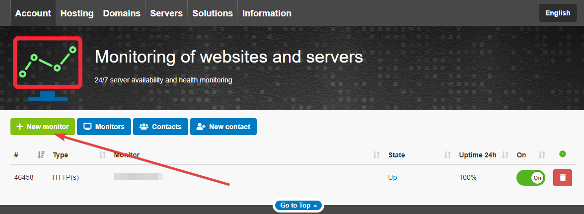 1) You can enter the monitoring control panel from your personal account - the section Services operation monitoring on the main page of your account. Or through the tab in the main menu Account - Services - Free monitoring.