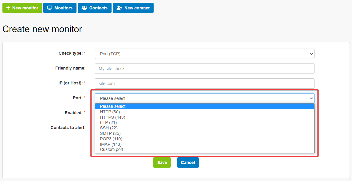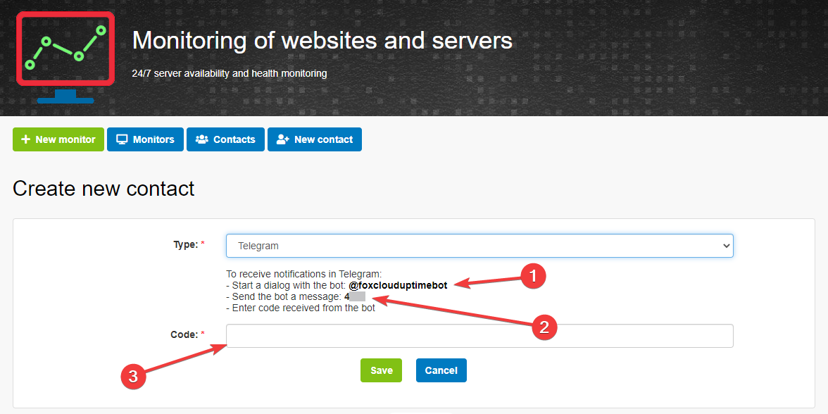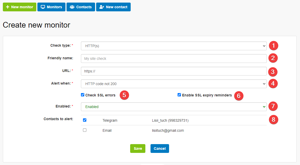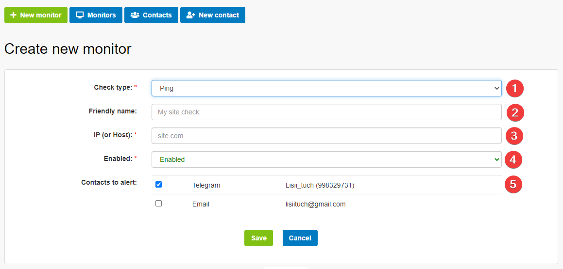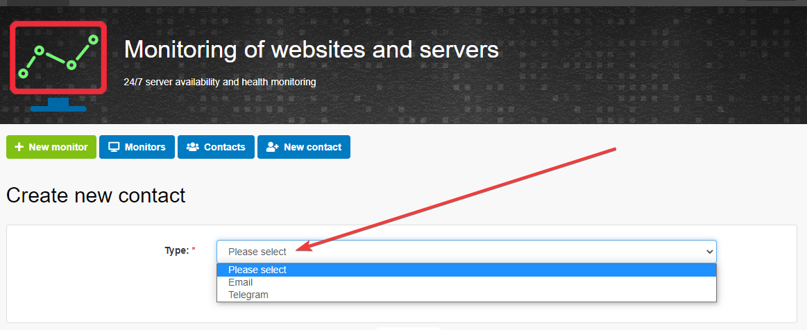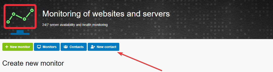 To add a contact, click on the "+ new contact" button on the monitoring page.