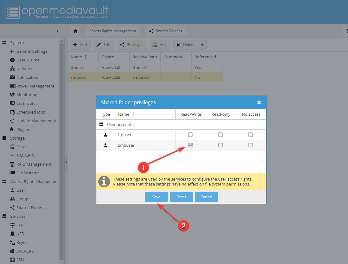In the window that opens tick the box next to Read / Write for the user smbuser (1) and click Save (2):
