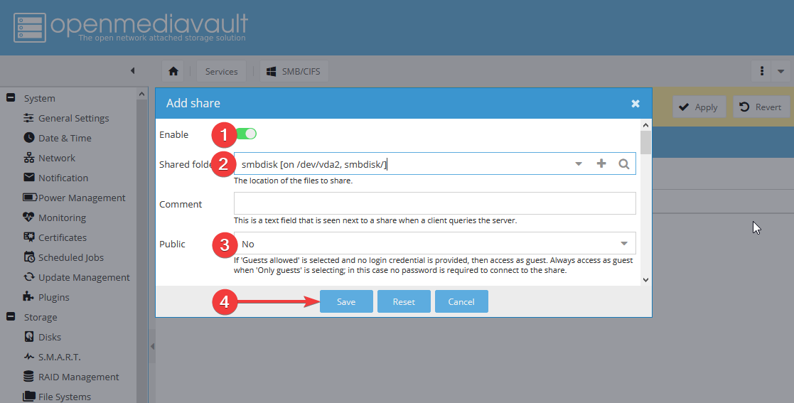 Fill in the form as follows: enable Share (1), select the created smbdisk folder in the Shared Folder field (2), specify None value in the Public field (3) and click Save (4):