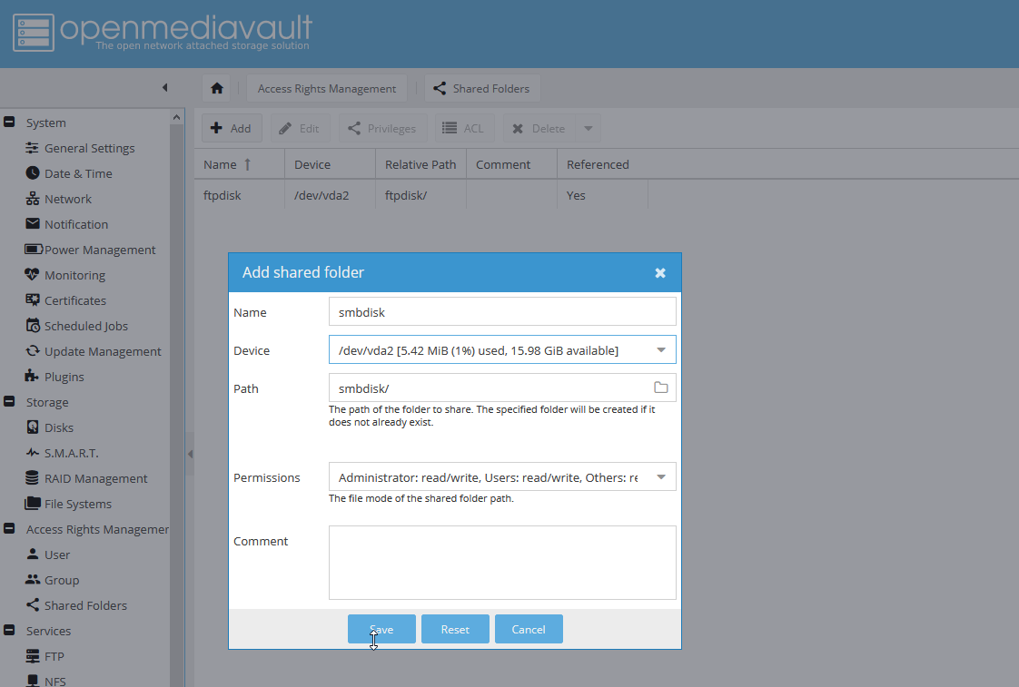 - Fill in the form for creating a shared folder, specifying the name and selecting a device. Let the remaining options by default and click Save.