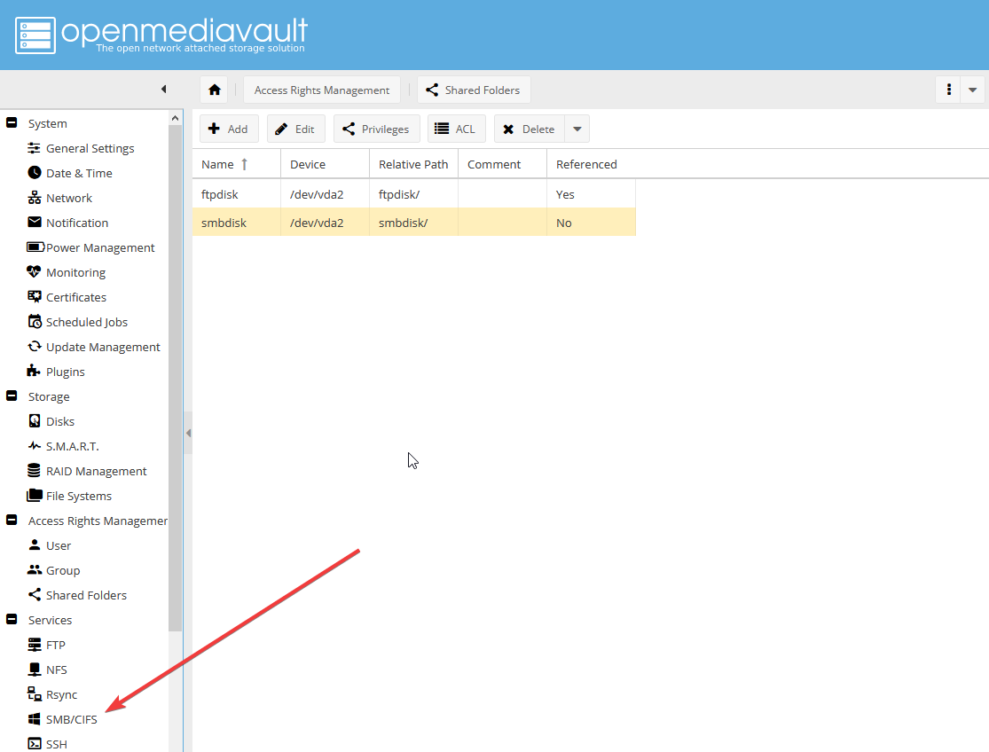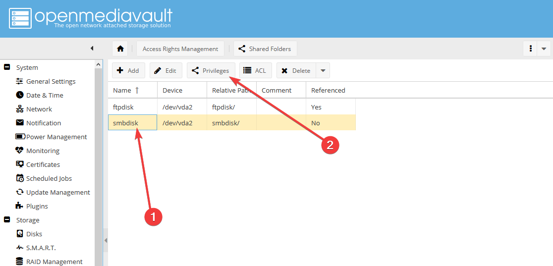 - Next you need to configure the smbuser user access to reading and writing: highlight the shared folder smbdisk (1) and click on Privileges (2):