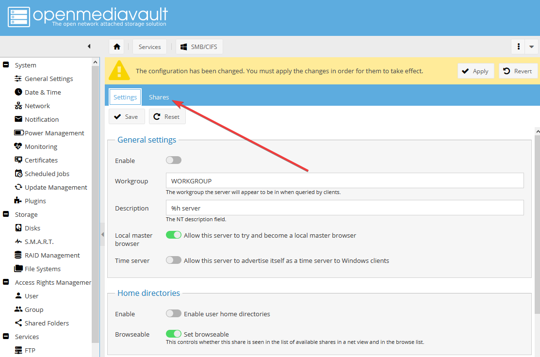 The window will close and you will have to confirm the changes. - In the side menu select Services> SMB / CIFS: