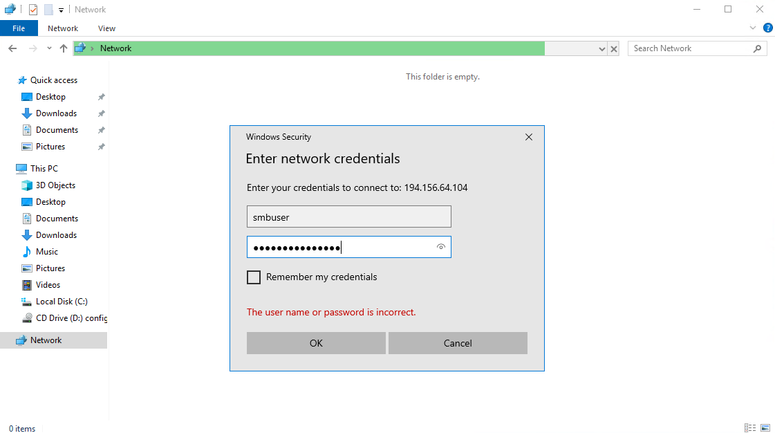 Enter the smbuser login and password that you specified at point 2 and click Ok.