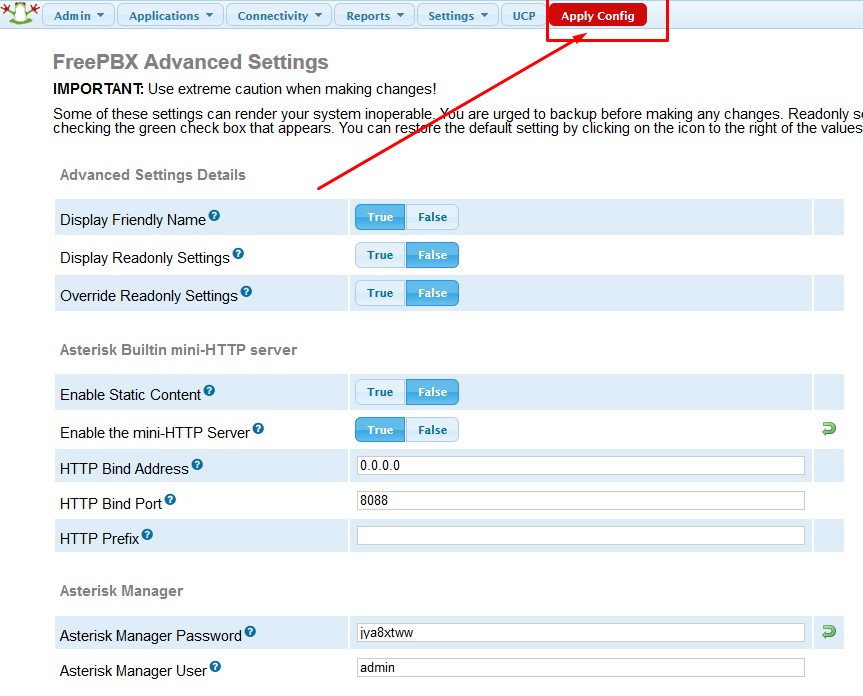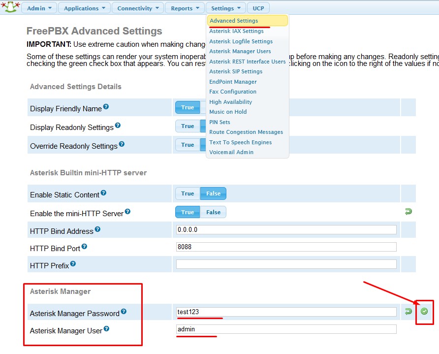 It is recommended to change password for "Asterisk Manager", to do this, open "Settings->Advanced Settings" and set new password in "Asterisk Manager Password" box.