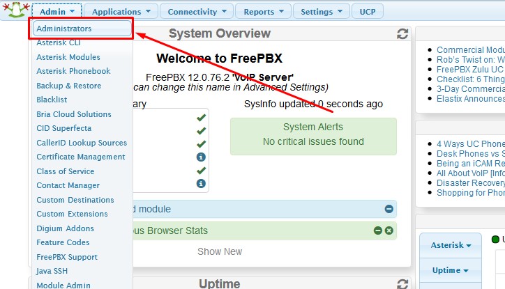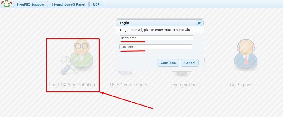 Login to FreePBX administrative area FreePBX( FreePBX Administration) using username and password from the activation email. (If for some reason you did not recieve it after payment please contact our support department).