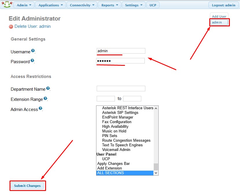 Open "Admin->Administrators". In the right part you can see list of available users of FreePBX. Select an exiting user ("admin"), enter the new password in the appropriate box and save the changes. (Note that you can also change the username). After clicking "Save changes" you will have to re-login in the admin panel using your new login details. (username and password).