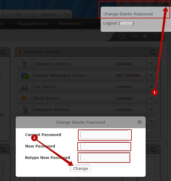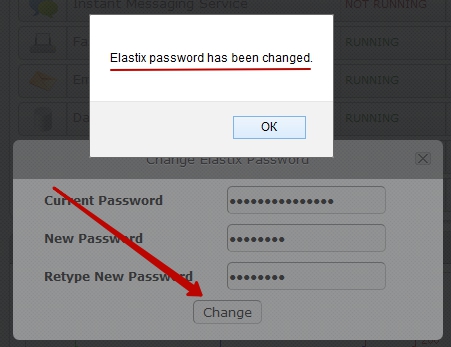 After authorization in the control panel, you will find a link "Change Elastix Password" in the upper right corner, where it is necessary to specify the current password and the new one.