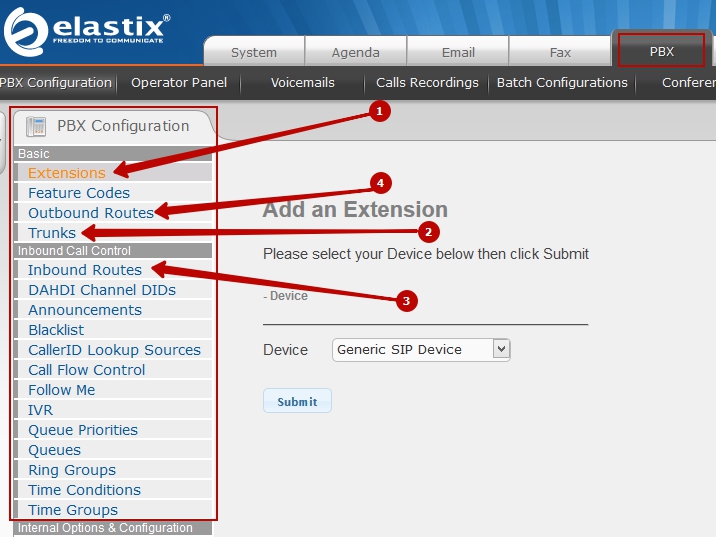 Please note that by going to the "PBX" menu you can see sections of the control panel similar to FreePBX.