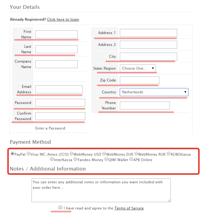 If you are not authorized in billing system ( in your account) login or register by filling all required fields and specify the way of payment.