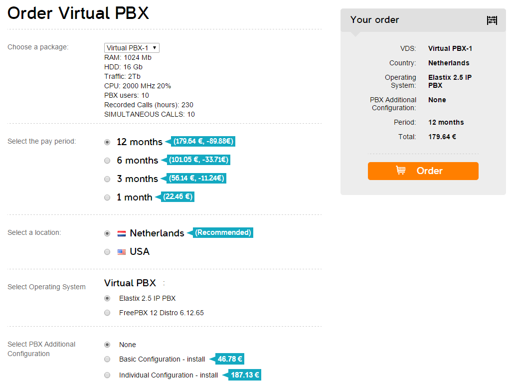 Select details proceeding optimal user count of PBX, phone call time recording, simultaneously recieve calls. Click "Order" button and go to next step of ordering