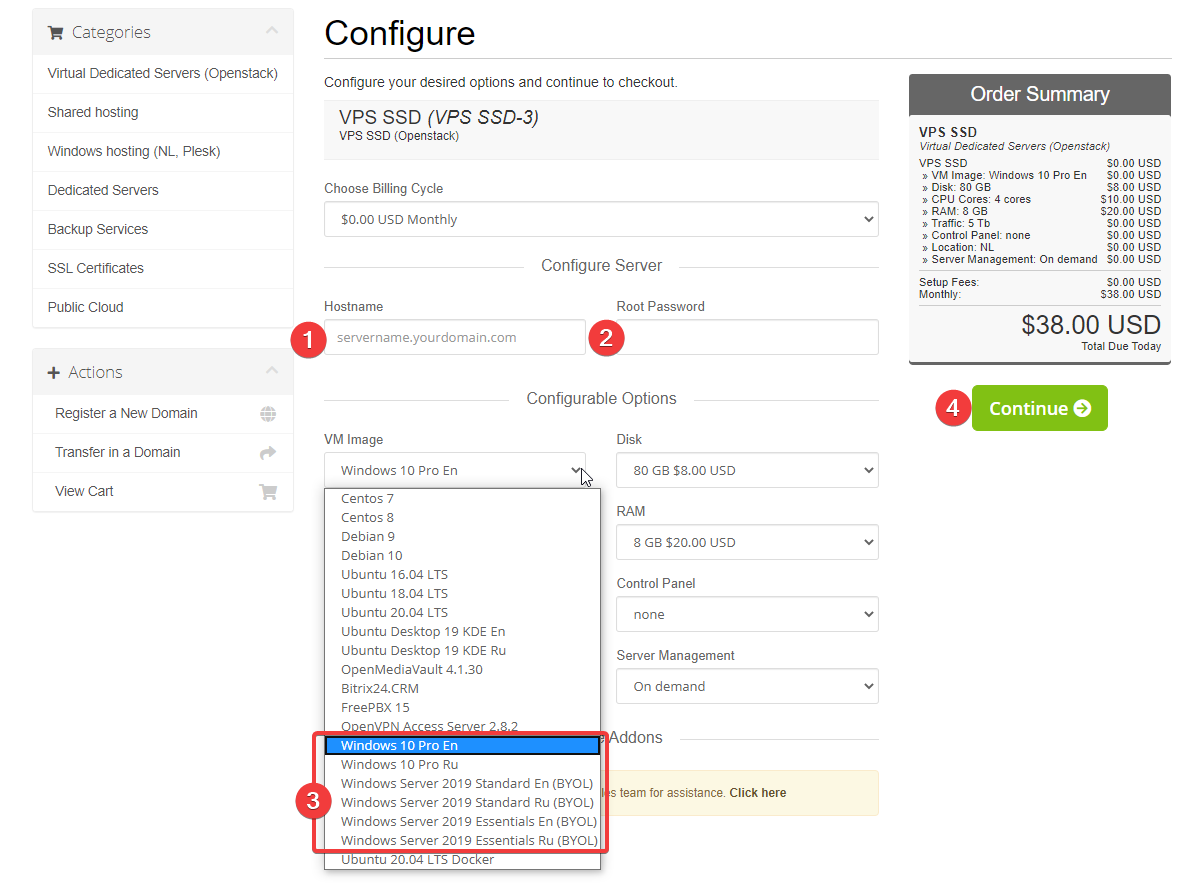 3. On the order page enter the server name (1), password (2) and select the image you need (3). Then click the “Next” button (4).