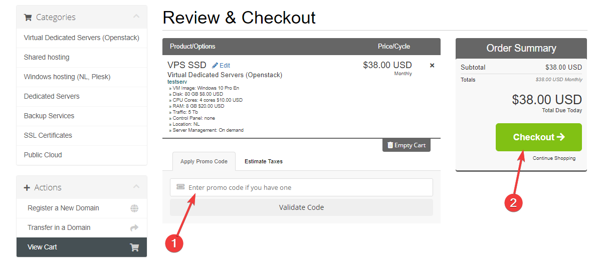 4. On the next page check the order, insert the promotional code if you have one (1) and click on "Buy" button (2)