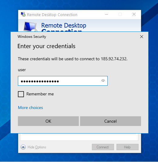 3) The Remote Desktop Connection window will open. Enter the host name (in our case this is the main IP from the activation letter) and the username.