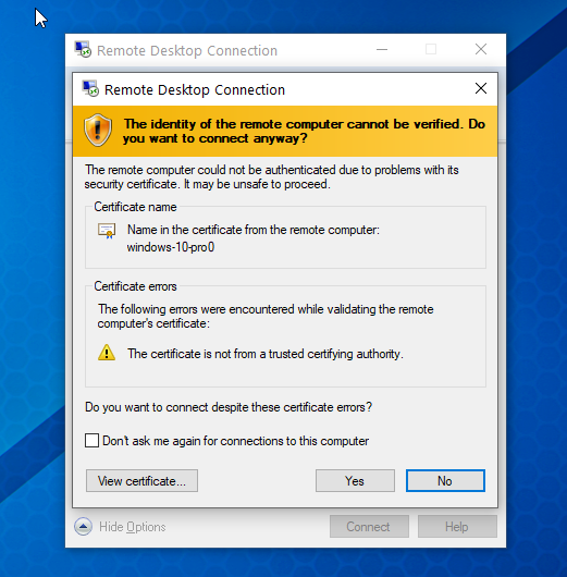 5) A certificate verification window will appear. In this case you do not need a certificate. Click OK and connect to the server.