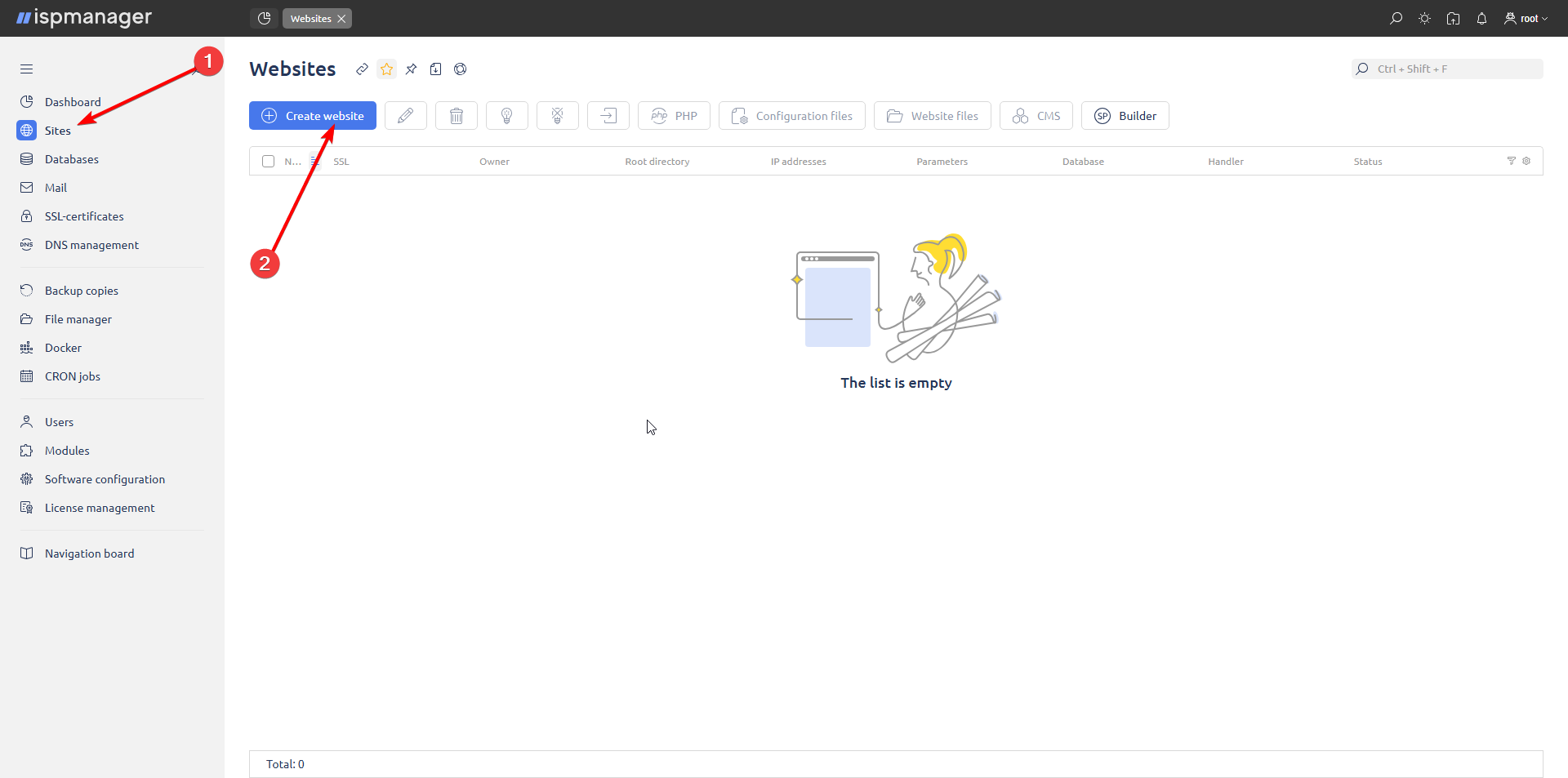 2. Go to the 'Sites'(1)  and click on 'Create Site' (2).