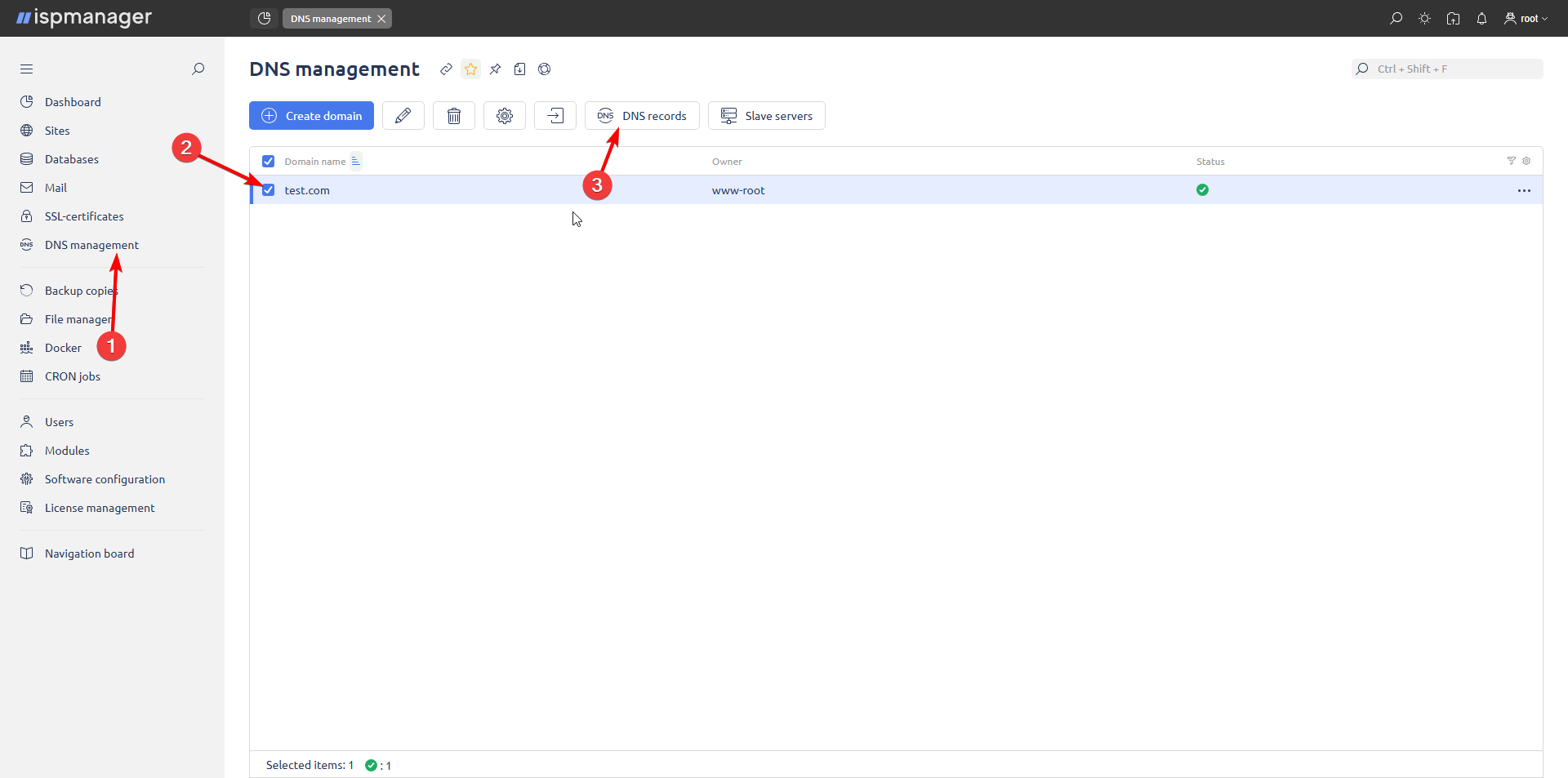 4. Navigate to 'DNS Management' (1), select the required domain (2) and click on 'DNS Records' (3).