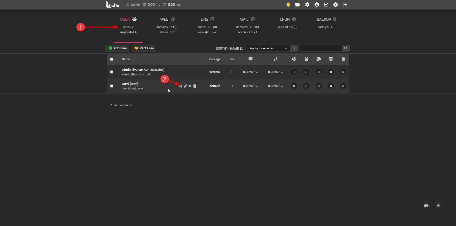 3. Go to the 'Users' (1), select the required user and log in as that user (2).