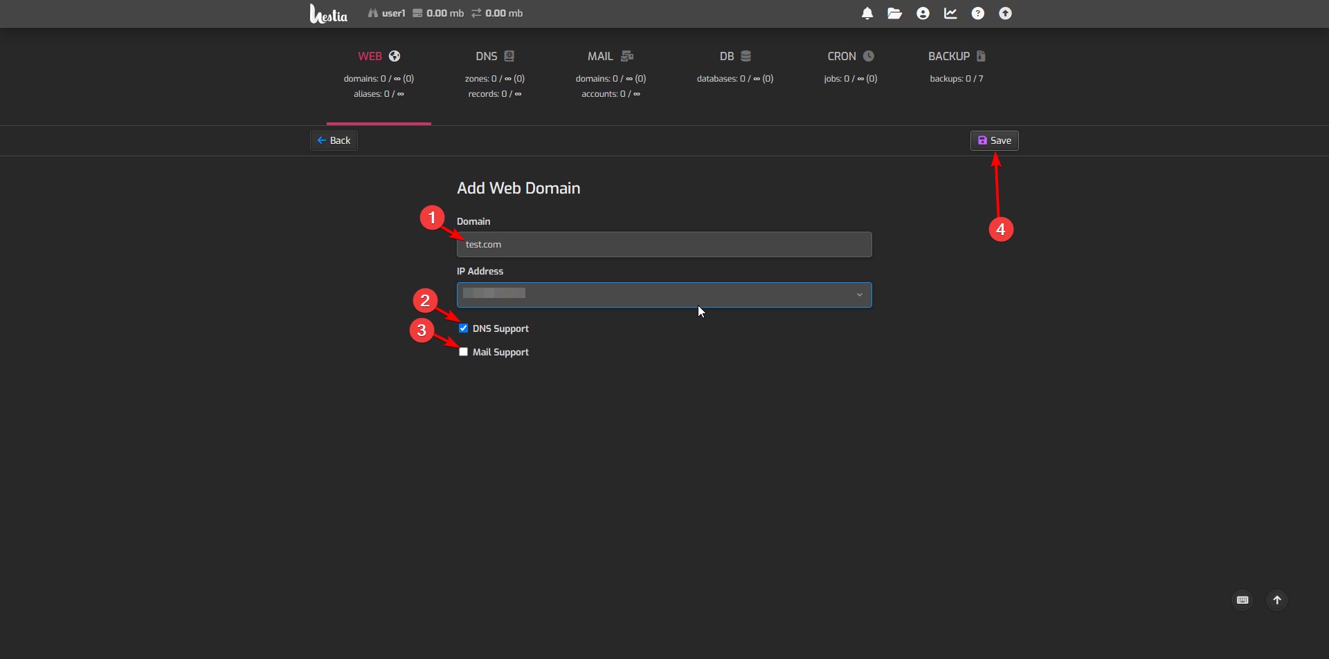 5. Fill in the 'Domain' field (1), select 'DNS support' (2) and 'Mail support' (3) if required, then save the changes (4).