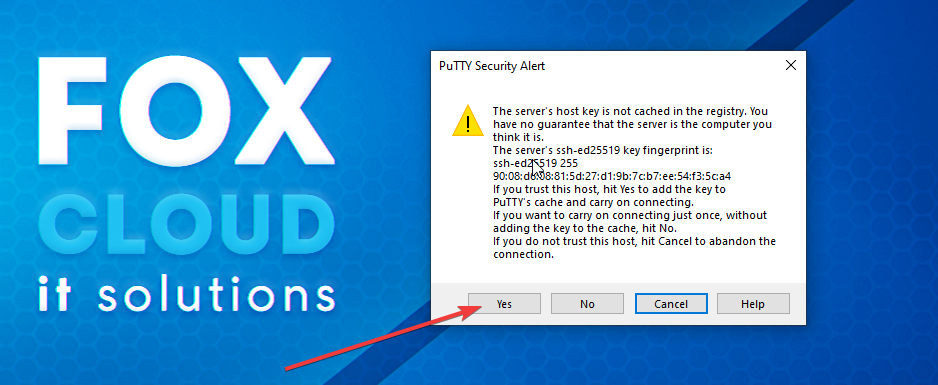 3. To continue click on "Yes" into the opened dialog window (this message appears in order to make "Putty" remember the server or if the IP adress of the server is not similar to that previously remembered by Putty for the given server).