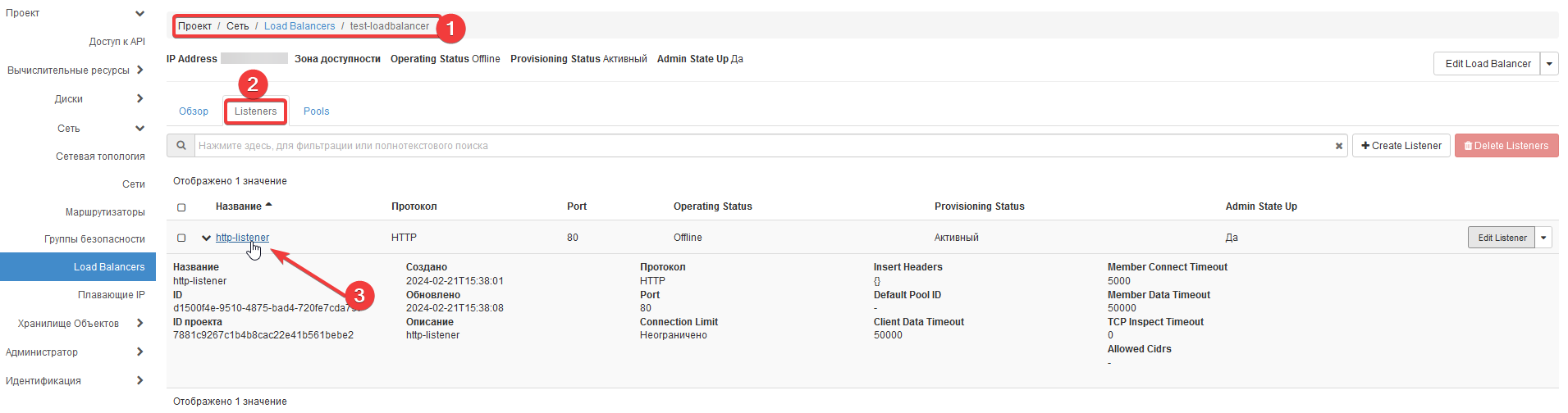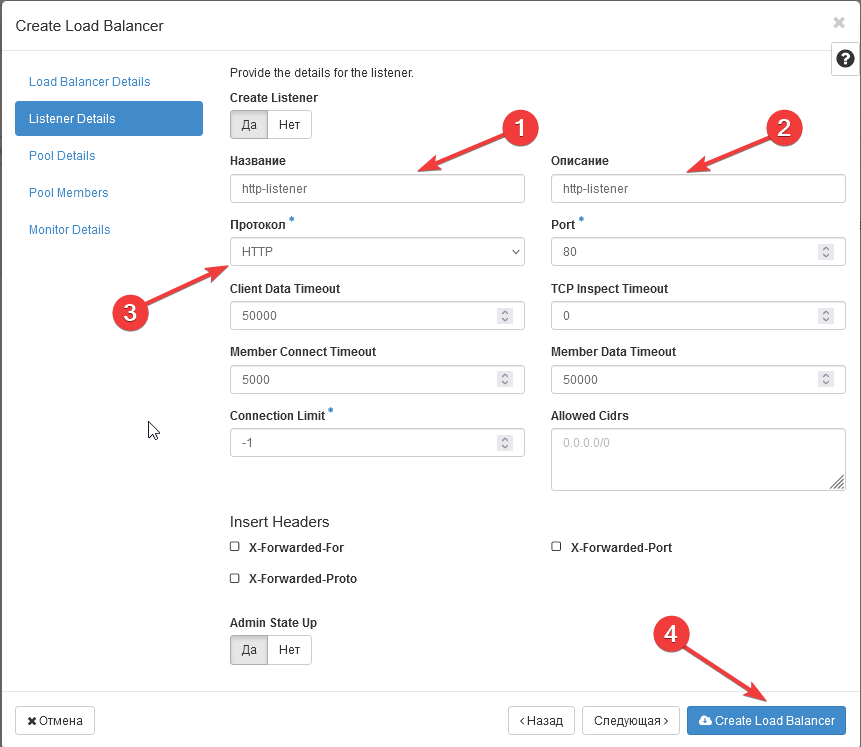 6 - Create Listener (Listener Details): Specify the name and protocol (in our case, HTTP) -> In the next tab "Pool Details" under "Create Pool," select "No" (in this example, a pool is not required) -> Click "Create Load Balancer."