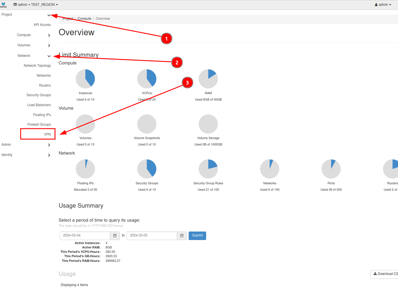 Before creating the VPN, log in to Horizon with your user credentials and prepare the instances (if they are not already created)