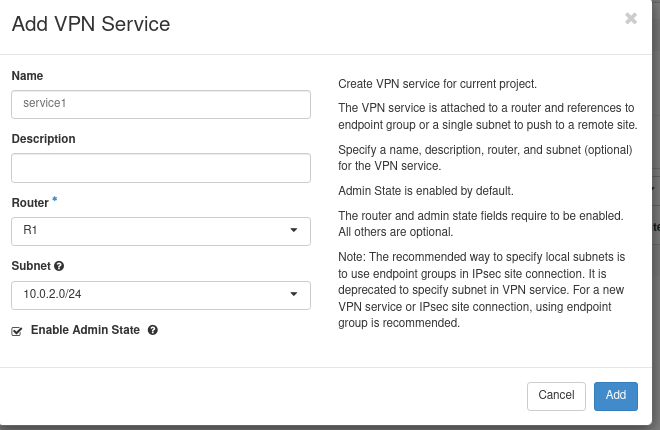 Create a new VPN service by selecting appropriate parameters, such as routers and subnets for each end of the tunnel.