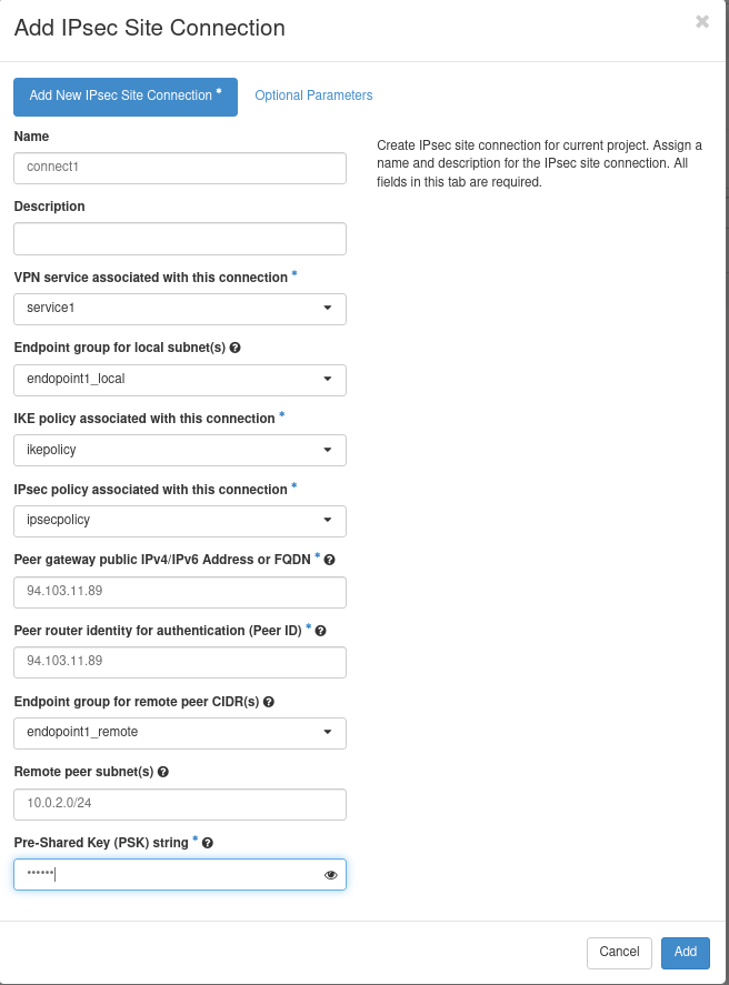 Step 6A. Configuring the IPsec Site Connection. Use the following parameters:
