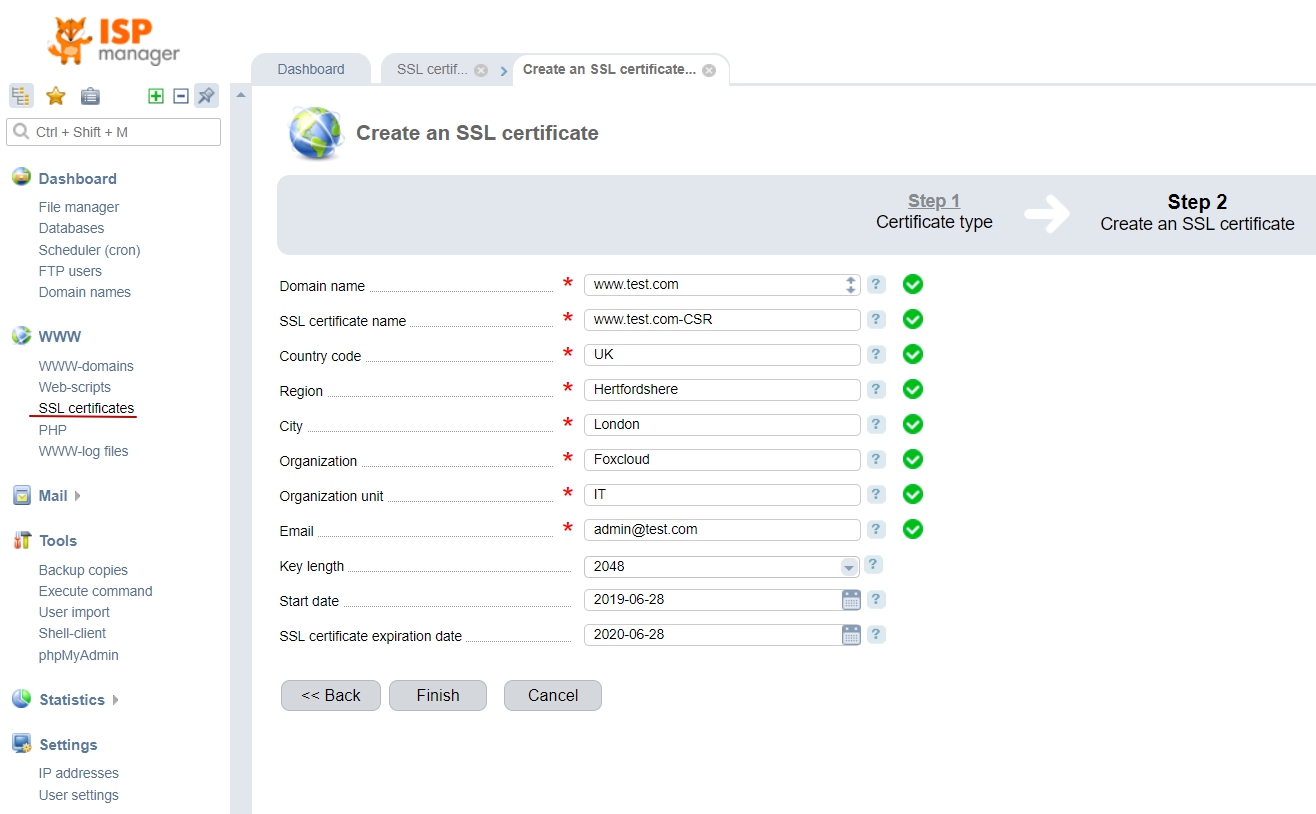 You can easily genarate a CSR (Certificate Signing Request) in ISPmanager to issue an SSL certificate for your domain name.