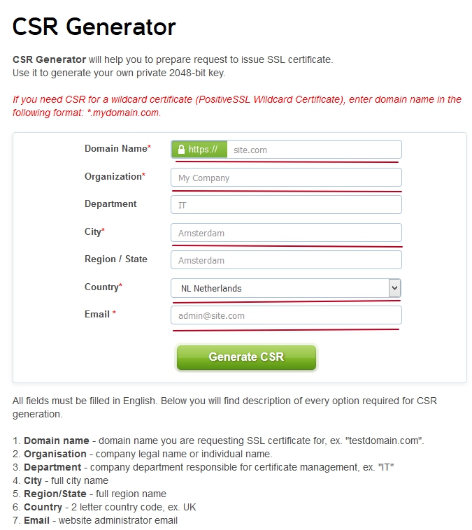 The procedure is very simple - just fill all necessary fields and click "Generate CSR"