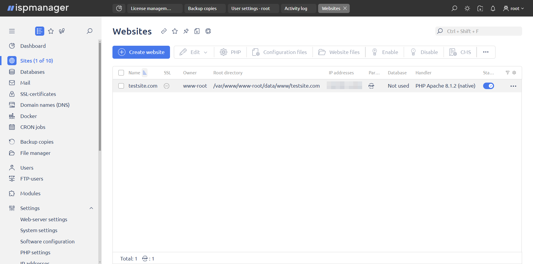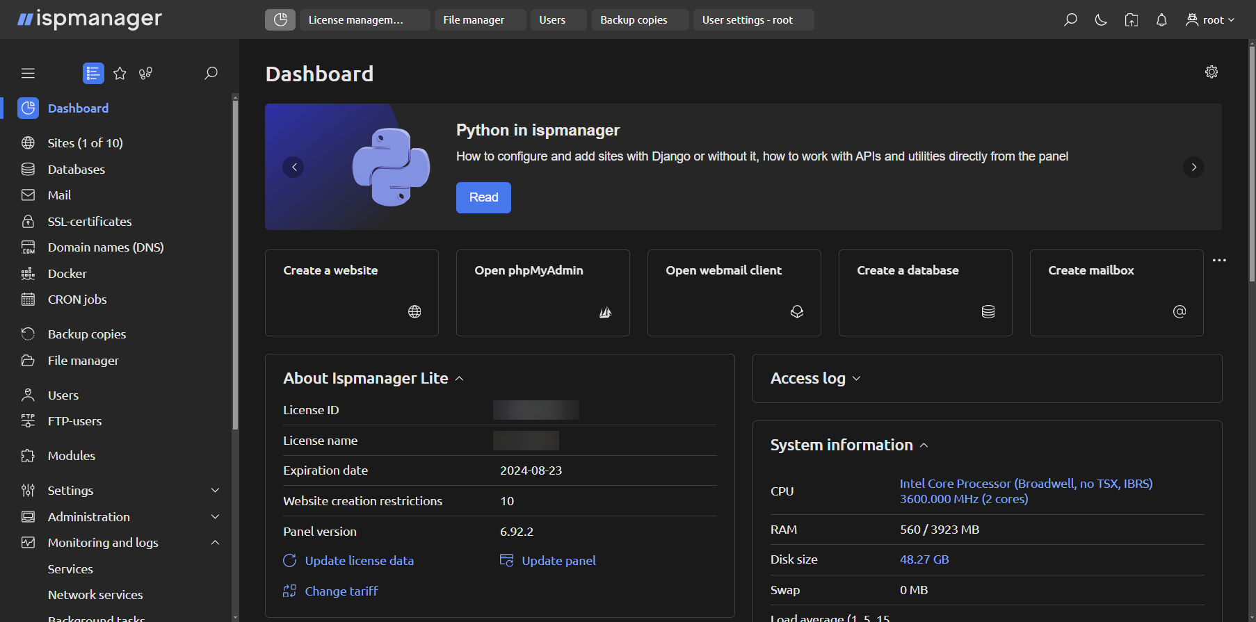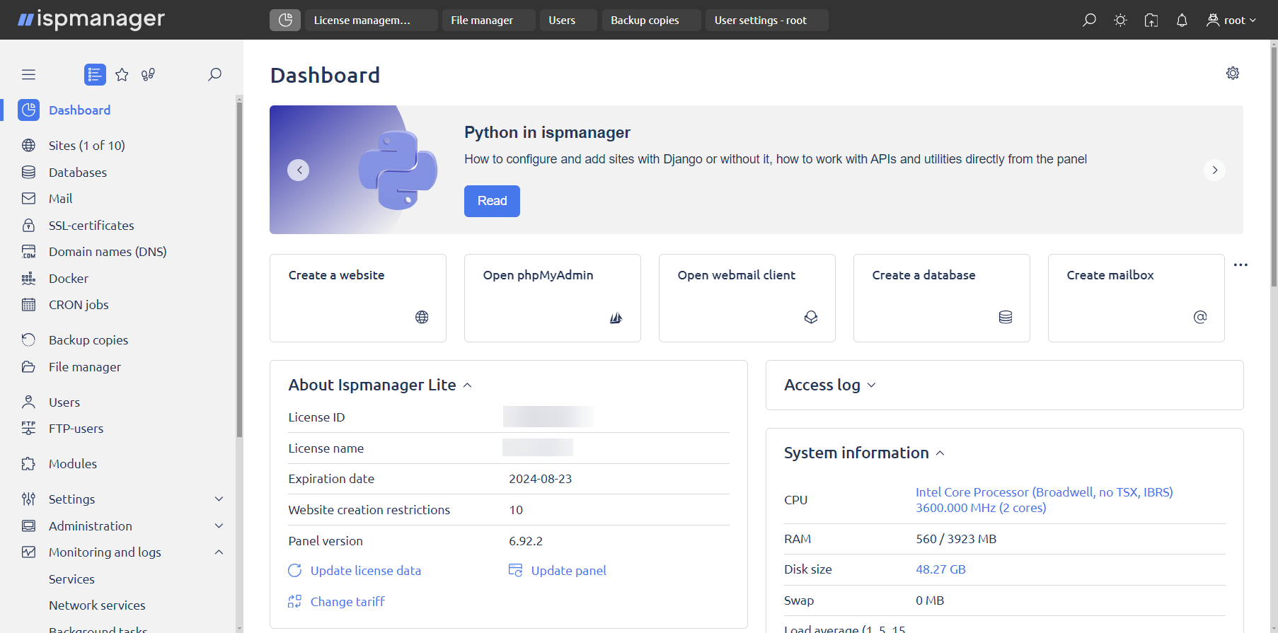 Also, the maximum number of sites depends on the type of ispmanager license. The base rates include an ispmanager lite license that allows you to host up to 10 domains, including subdomains. You can upgrade your license at any time.