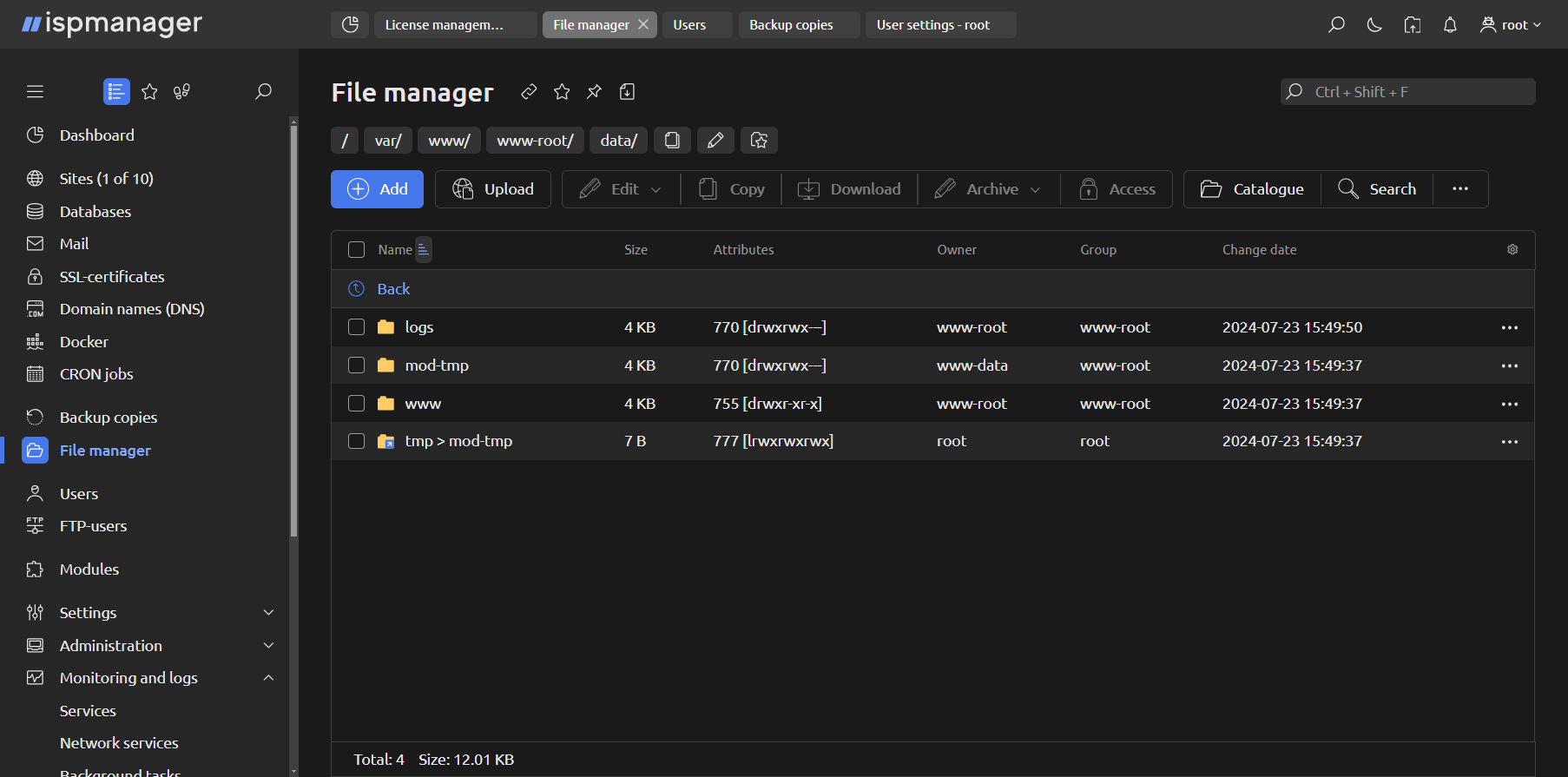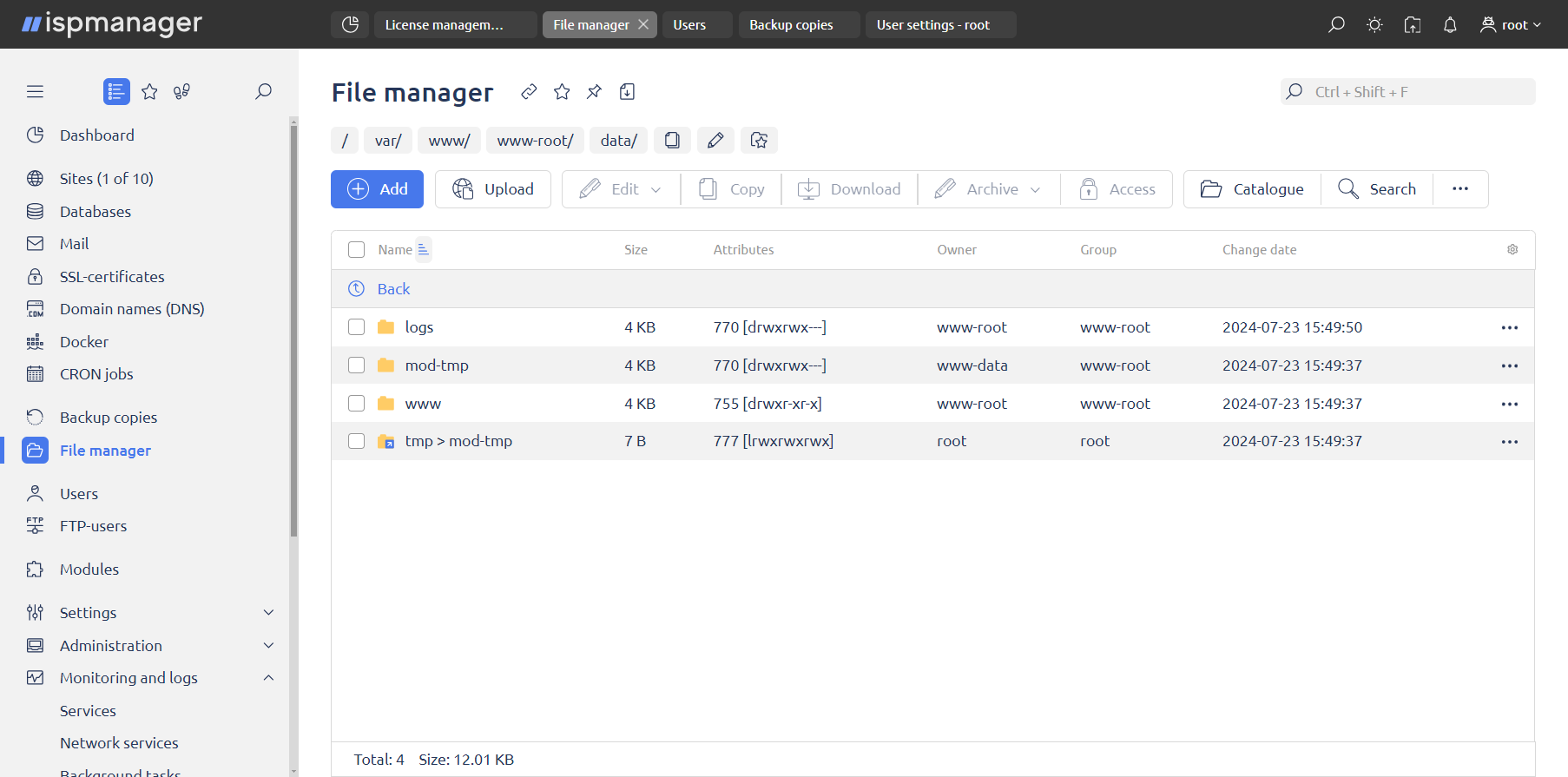 Using the ispmanager control panel, you can upload a website to the server, manage domain zones and mail, install SSL certificates, create users and configure security policies. And all this - through the Web interface in an Internet browser, without going directly to the server.